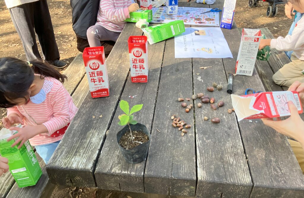 ピクニック広場を舞台として遊びながら森を学ぶイベントの第2回として行いました。今回は、落ち葉プール用の落ち葉を集めて、みんなで落ち葉だらけになって遊びました!そのあとは、森の木を育ててもらうために、牛乳パックに土とドングリを入れて、森の木を育てる準備をしてもらいました!最後は、植えたどんぐりに、伸びろ~伸びろ~と伸びろ体操をして、イベントを終了しました。ぐんぐん大きくなって、このピクニック広場に植えるときが楽しみです😊