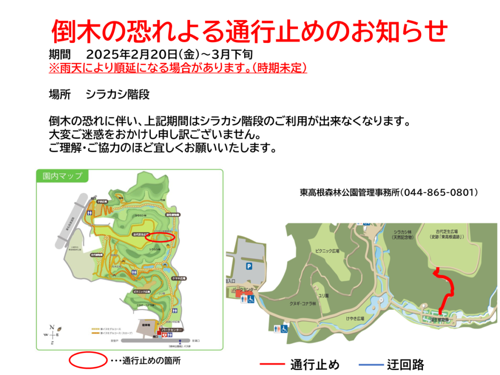 倒木の恐れがありますシラカシ階段におきまして、安全確保のため通行止めを実施させていただきます。期間は2月20日(金)~で、解除時期はまだ未定となっております。